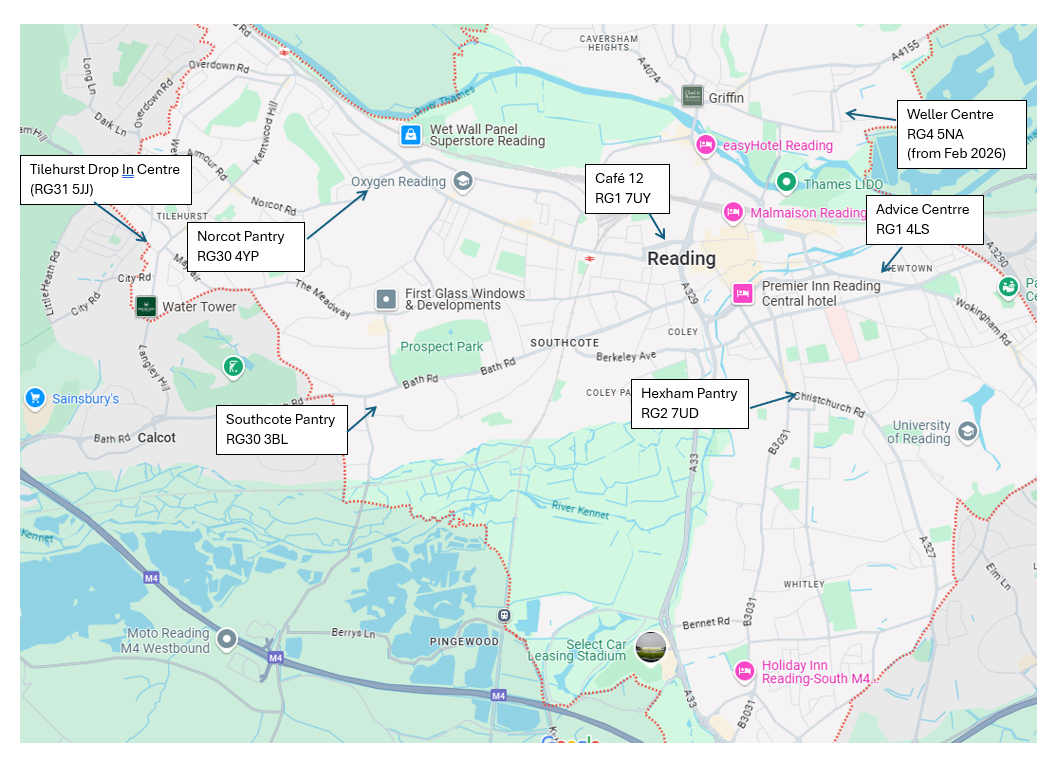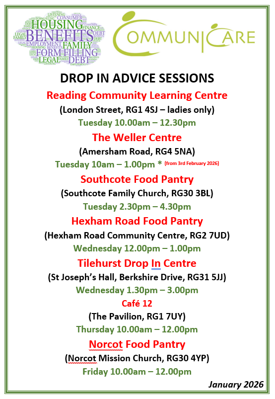 As well as our Advice Centre in East Reading, we run outreach sessions in other areas across Reading. Our current sessions are shown opposite.